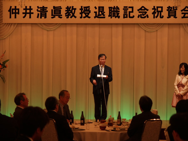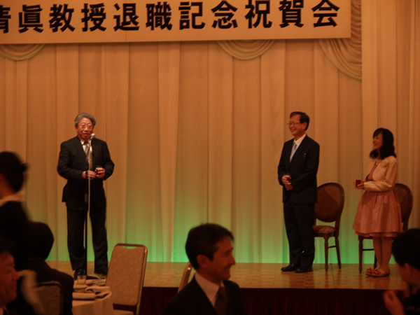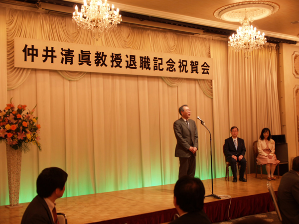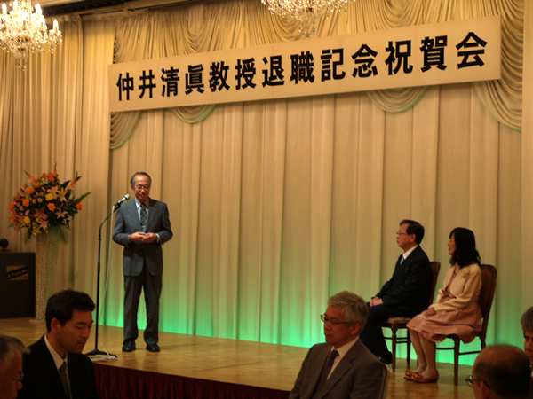 仲井清眞名誉教授の退職記念祝賀会を国際ホテル松山にて開催しました。藤井コース長の祝辞に始まり、最後には目録・花束贈呈を行って盛況のうちに終了しました。(その他の写真は、同窓会のページにあります。研究室関係者限定です。)2014年5月4日