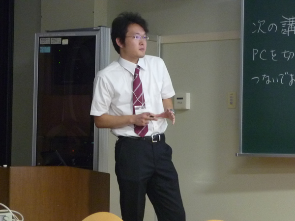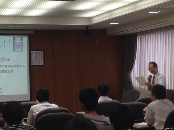 阪本先生が研究室の学生に対し、研究を安全に行うための安全講習を行い、薬品の取り扱いや各種装置の安全上の注意等を説明しました。2014年4月11日