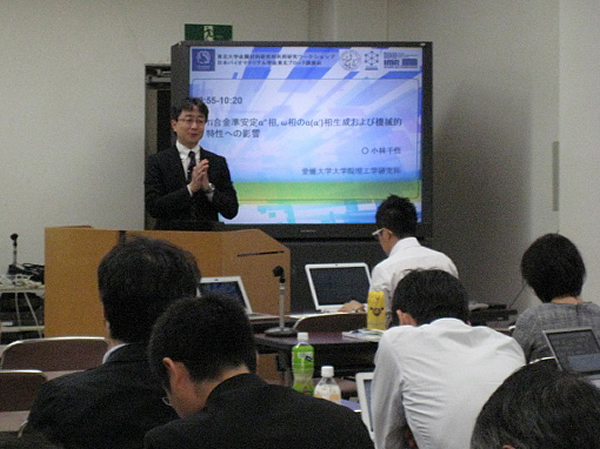 小林准教授が東北大学金属材料研究所にて開催されました「産学官連携による金属系バイオマテリアルの研究開発の最前線」にて研究講演を行いました。講演題目は、「Ti合金準安定α”相, ω相のα(α’)相生成および機械的特性への影響」であり、論文 “S. Kobayashi et al.: Metall. Mater. Trans. A, 45A (2014) pp. 1217 – 1229.”の内容を中心とした材料組織の微細化に関する基礎的な内容からその応用について講演しました。2014年10月3日