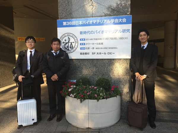 小林准教授がタワーホール船堀にて開催されました「第36回日本バイオマテリアル学会大会」にて研究講演を行いました。講演題目は、「各種金属及びその酸化物上への骨芽細胞初期接着性評価」(共同研究者:M1 山内勇樹君、岡野 聡先生)。写真は、いつもお世話になっている、関西大学の上田正人先生と愛媛大学の岡野 聡先生とともに、学会会場の看板前にて撮影。2014年11月14日