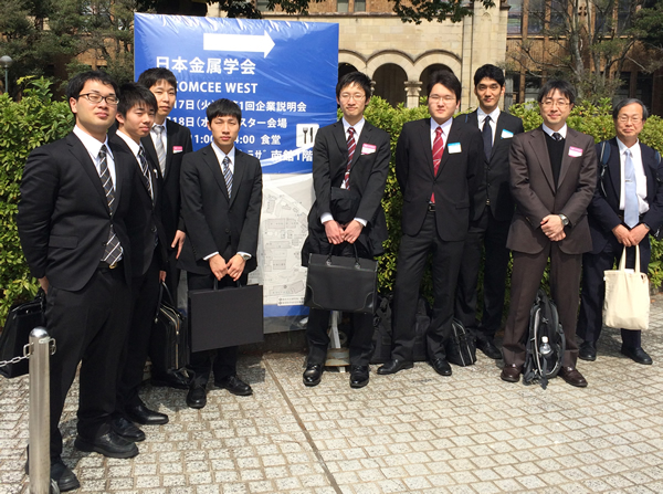 (株)神戸製鋼所 高砂製作所にて開催されました「第2回 チタン若手研究者・技術者交流会」に小林准教授・M1 真鍋慶祐君、M1 十亀宏明君が参加しました。午前中は、(株)神戸製鋼所の工場見学をさせていただき、チタンの製造・熱処理施設を初めて見ました。さすが、チタンの工場は綺麗でした。午後は、若手のチタン研究者の発表を聞き、懇親会では企業の方々と交流しました。大変楽しい会となりました。交流会終了後は、研究室の卒業生で現在、(株)神戸製鋼所に勤務の若元 陸 様と懇親会を開きました。2014年10月6日~7日
