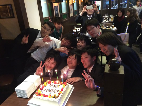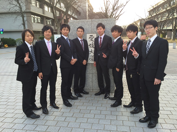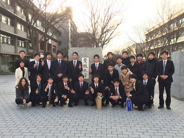 愛媛大学にて卒業式・修了式が行われました。当研究室では、院生8名、学部生7名が修了ならびに卒業しました。皆、元気に社会で活躍することを祈念して、楽しく飲み明かしました。大変楽しいメンバーで、飲み会ではパワーのある余興(笑)で大変盛り上げてくれたので、それが見れなくなるのは残念ですが、社会に出てもそのパワーで困難を乗り越えて行ってくれたらと思います。2015年3月17~20日